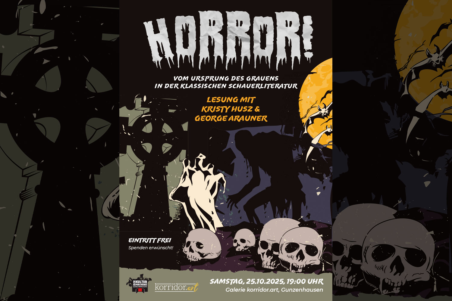 Diesen und weiteren Fragen wollen die Literaturwissenschaftlerin Kristy Husz und der Galerist und Autor George Arauner – beide große Fans der phantastischen Literatur und ihrer bizarren Figuren – bei einer Lesung wenige Tage vor Halloween genauer nachgehen. Natürlich stilecht verkleidet, was auch dem Publikum empfohlen wird…
