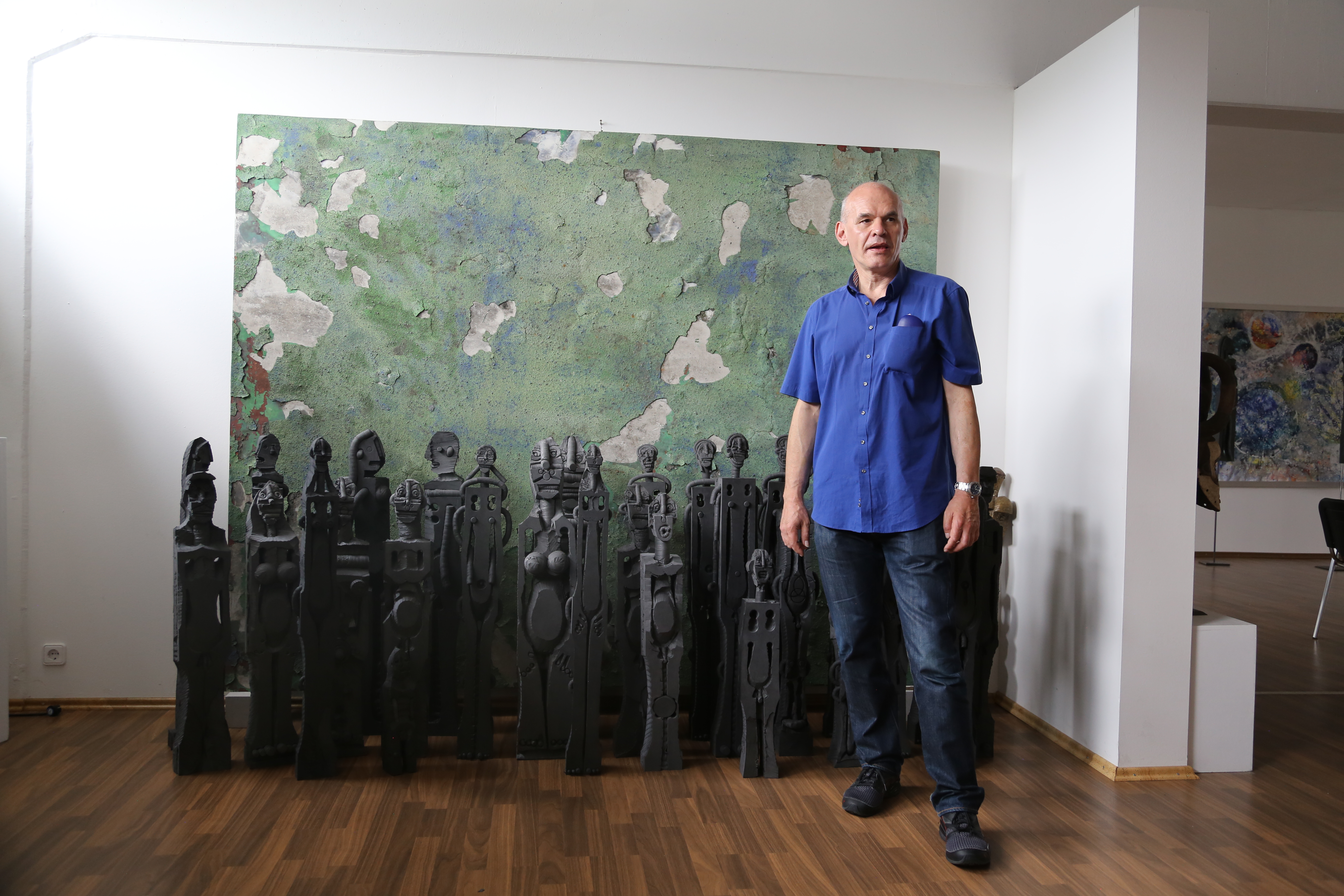 Seine fröhlich leuchtenden knallfarbenen Bilder muten archaisch an, wie seine wetterfesten Skulpturen aus dem Kunststoff Polyethylen. Normalerweise wird das Material zur Schall- und Wärmedämmung und anderem verwendet.